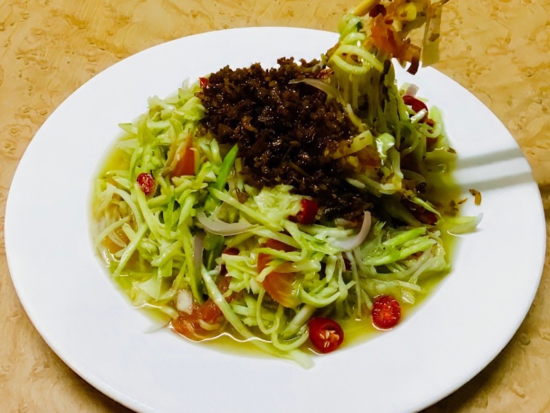 - Sediakan mangga muda – kupas dan sagat halus atau boleh di cincang kasar.